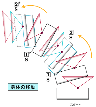 男性―右足前進(女性―左足後退)の時、体が右サイドリーディング(女性―左サイドリーディング)がかかります。